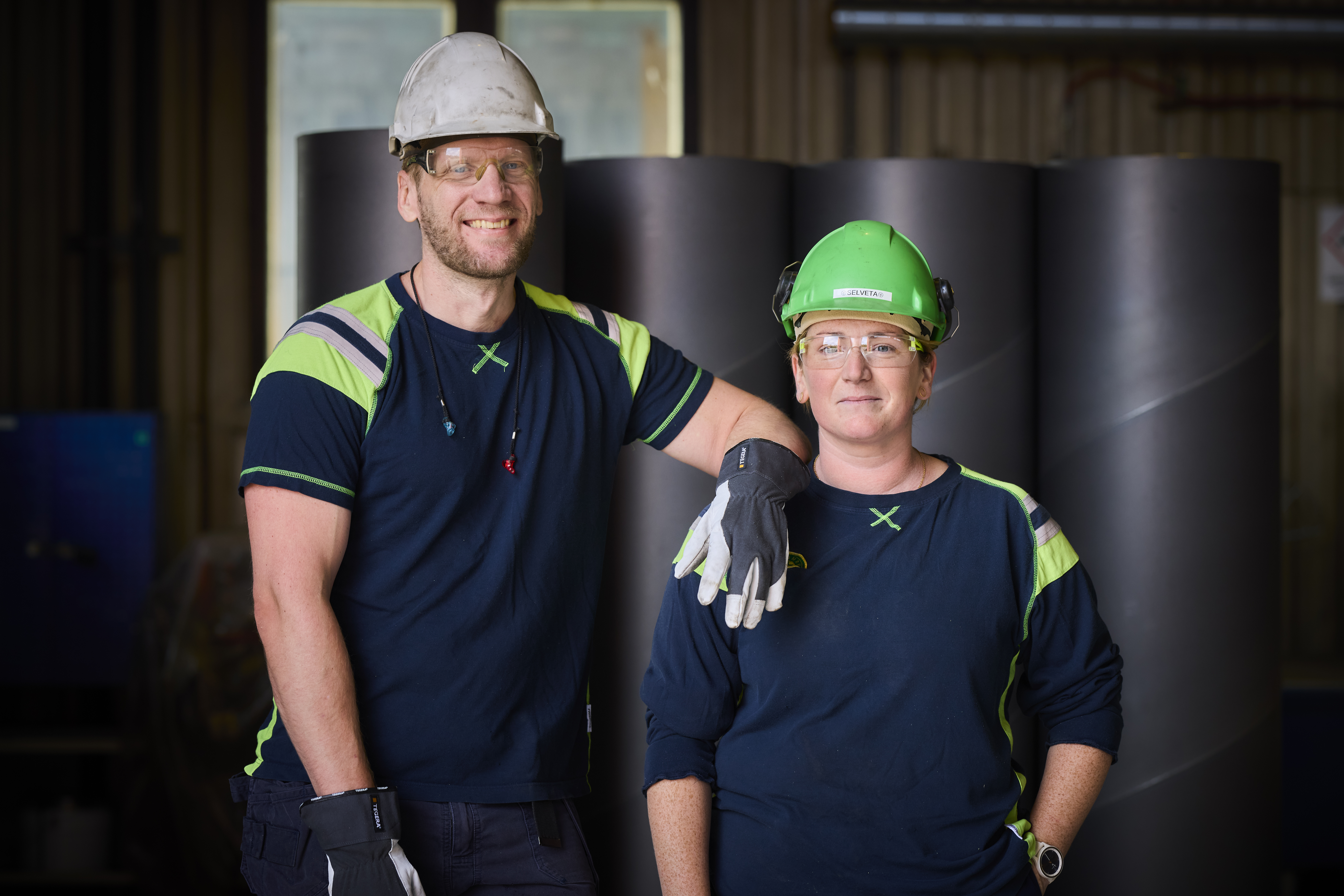 Fredrik Pettersson och Selveta Wåhlen. I bakgrunden: kapslar för kompaktering av stålpulver. Erasteel Kloster AB.