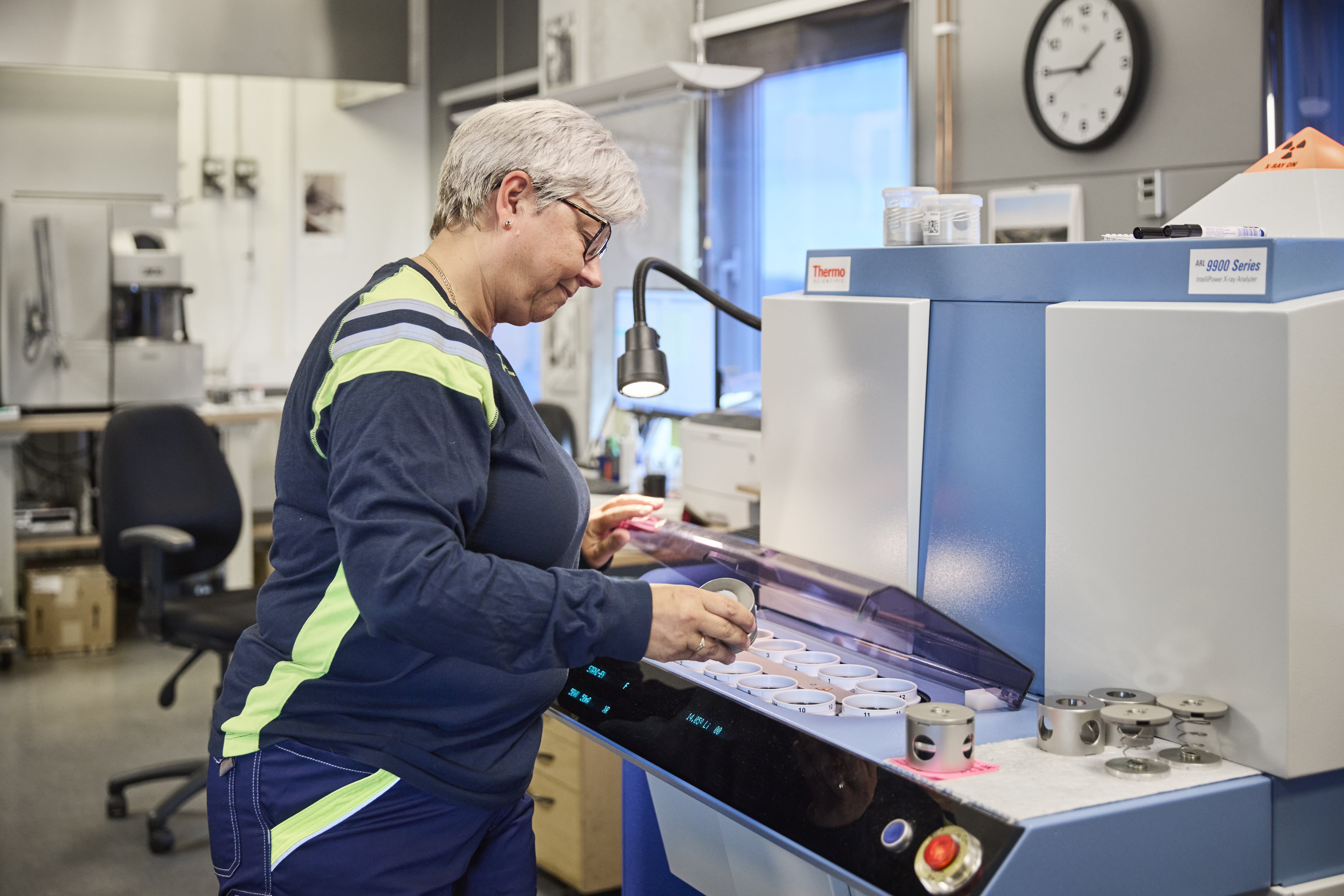 Susanne Lindberg förbereder stålprov för analys. Analyslaboratoriet i gasatomiseringstornet Durin. Erasteel Kloster AB.