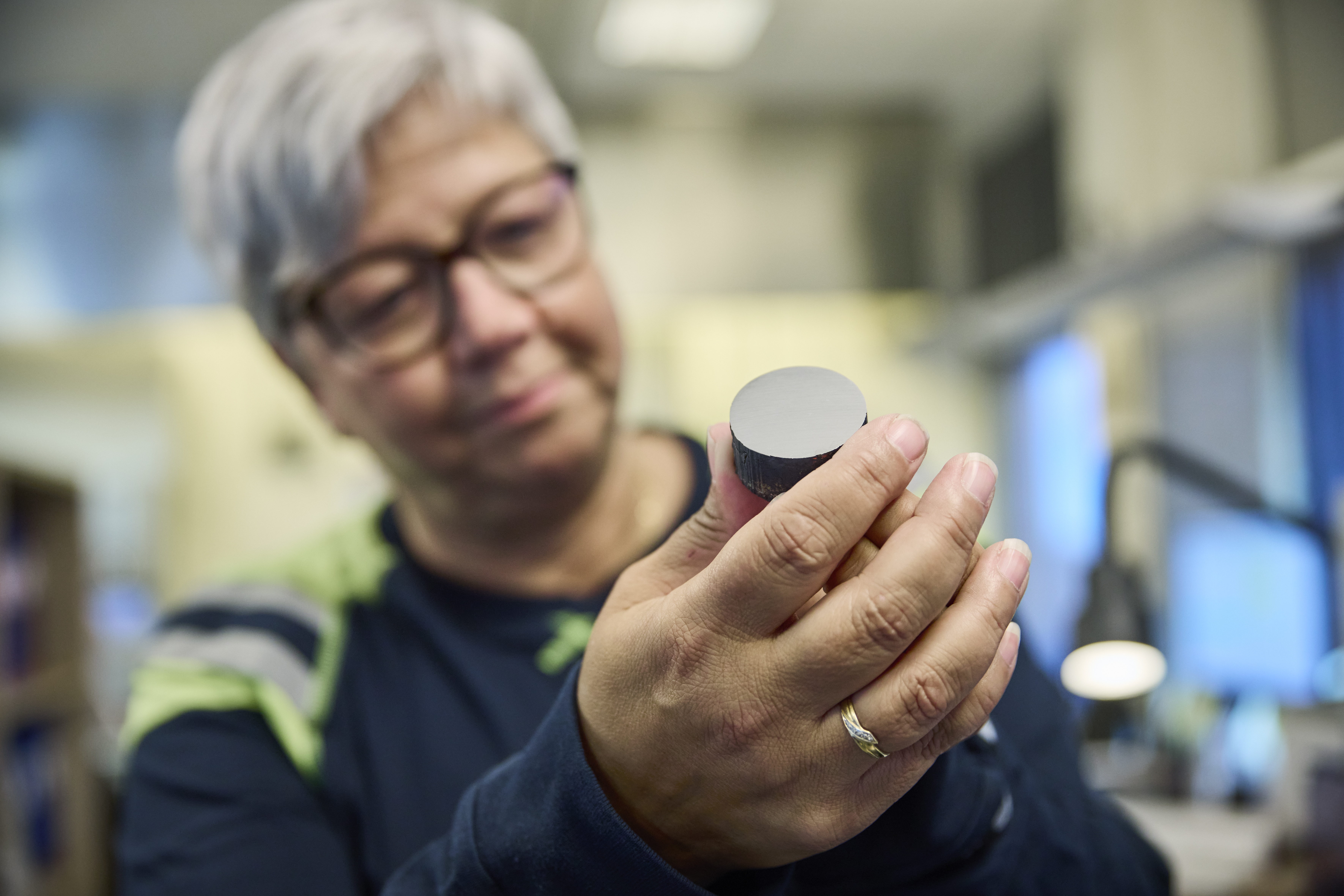 Susanne Lindberg förbereder stålprov för analys. Analyslaboratoriet i gasatomiseringstornet Durin. Erasteel Kloster AB.