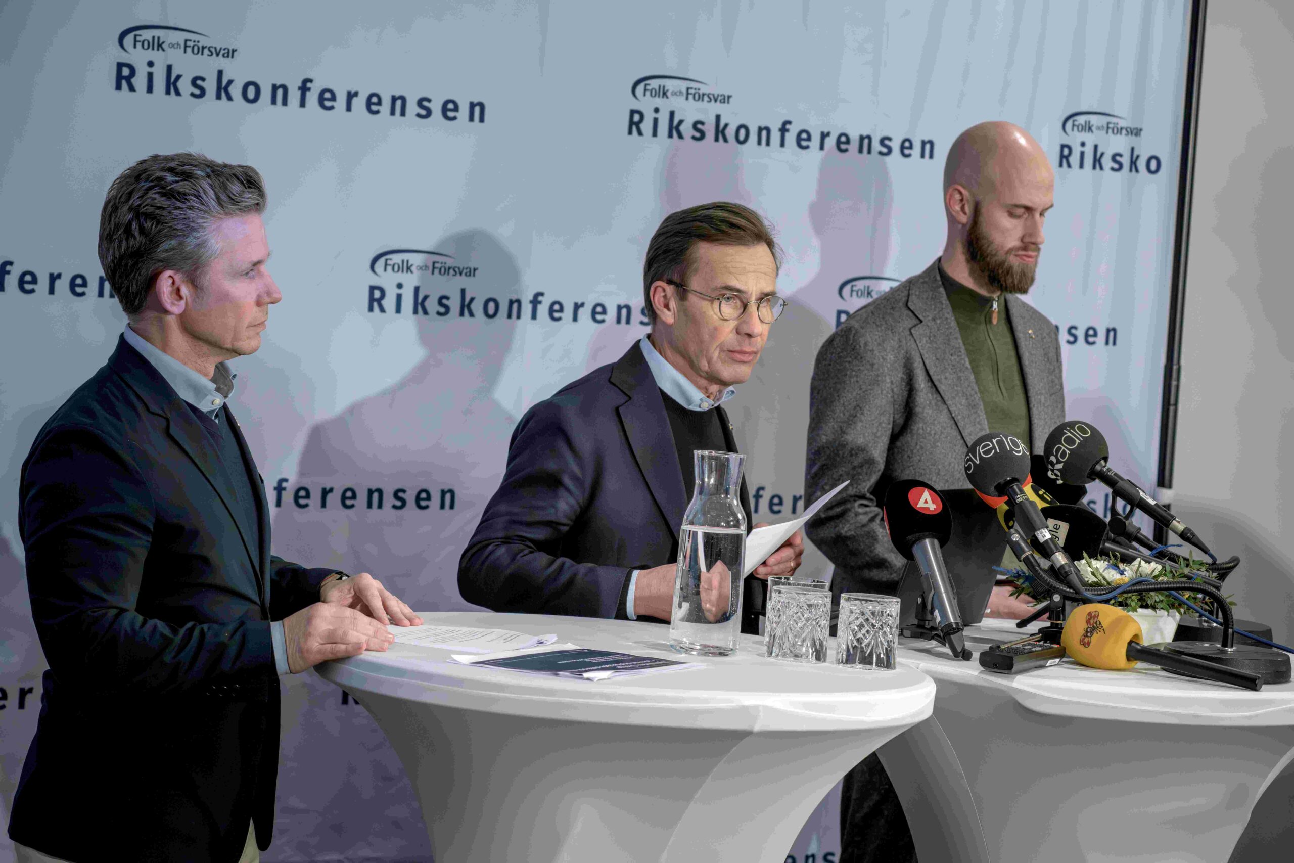 Pål Jonson, försvarsminister, Ulf Kristersson, statsminister, och Carl-Oskar Bohlin, minister för civilt försvar, på scen under årets konferens i Sälen. Foto: Ulf Malm, pressbild.