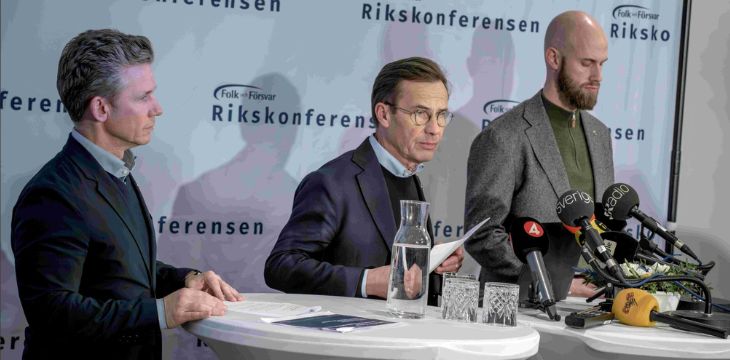 Pål Jonson, försvarsminister, Ulf Kristersson, statsminister, och Carl-Oskar Bohlin, minister för civilt försvar, på scen under årets konferens i Sälen. Foto: Ulf Malm, pressbild.