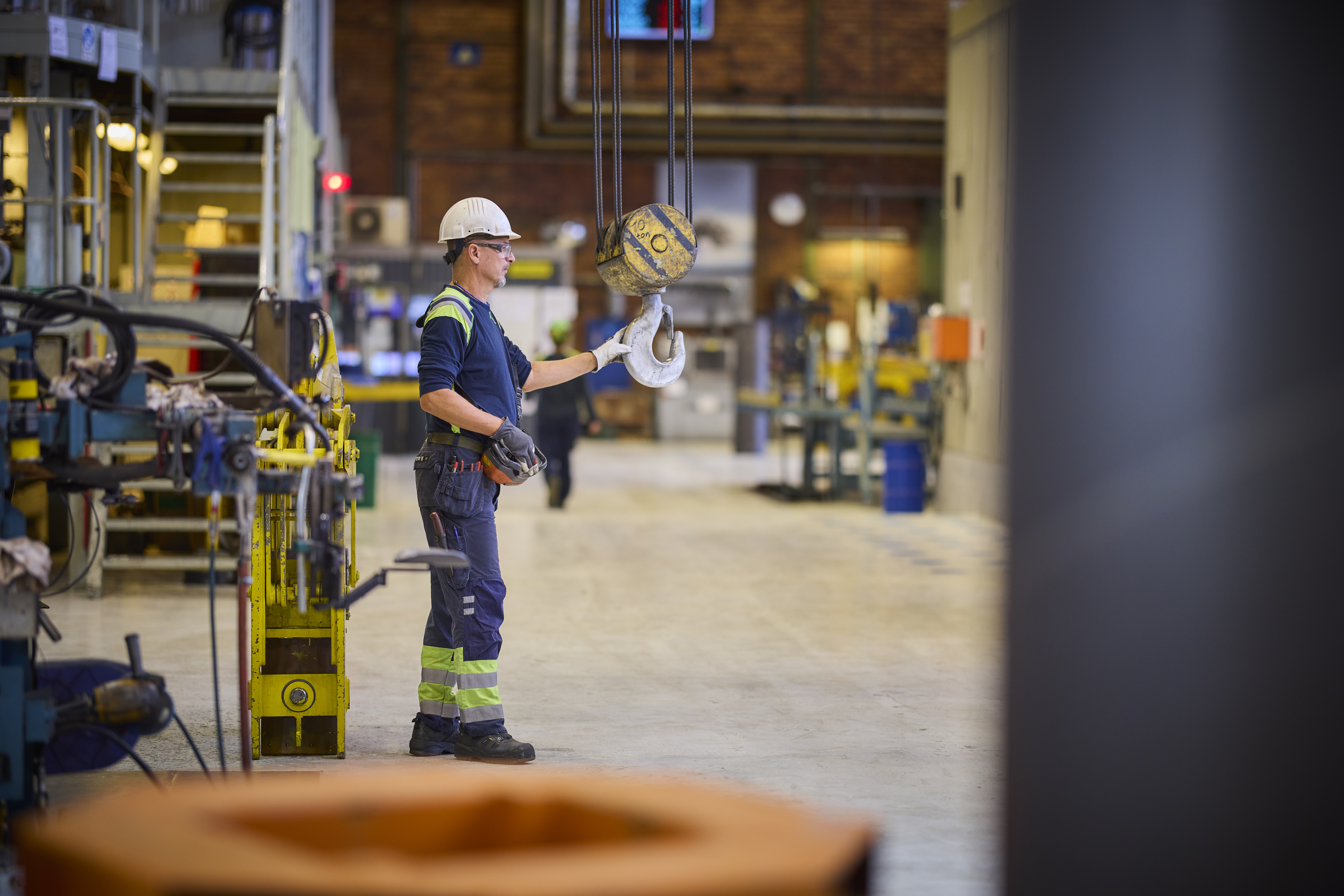 Roger Wiberg förflyttar kapslar för kompaktering av stålpulver. Erasteel Kloster AB.