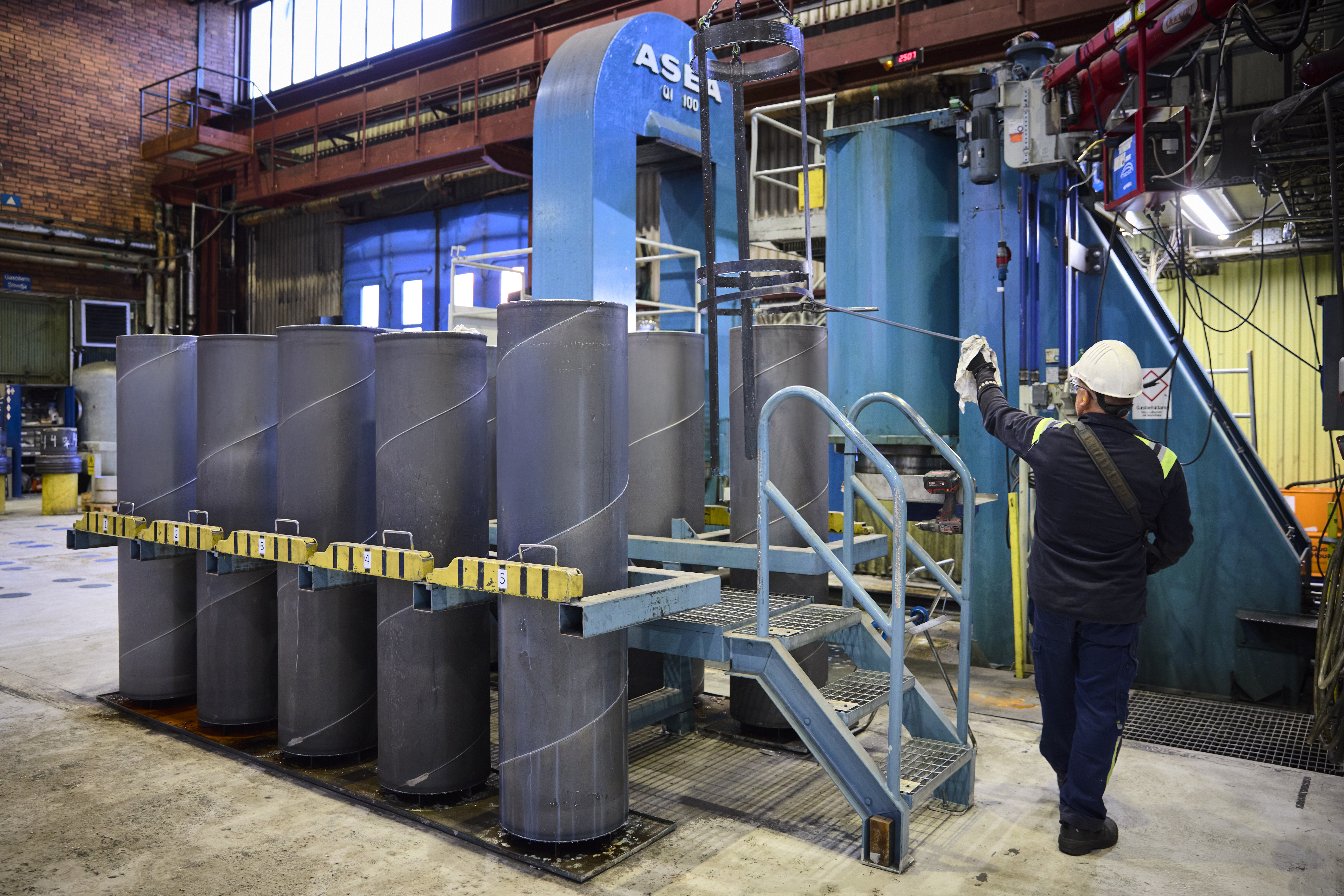Mikko Myllyniemi förbereder kapslar för kompaktering av stålpulver genom hetisostatisk pressning (HIP). Erasteel Kloster AB.