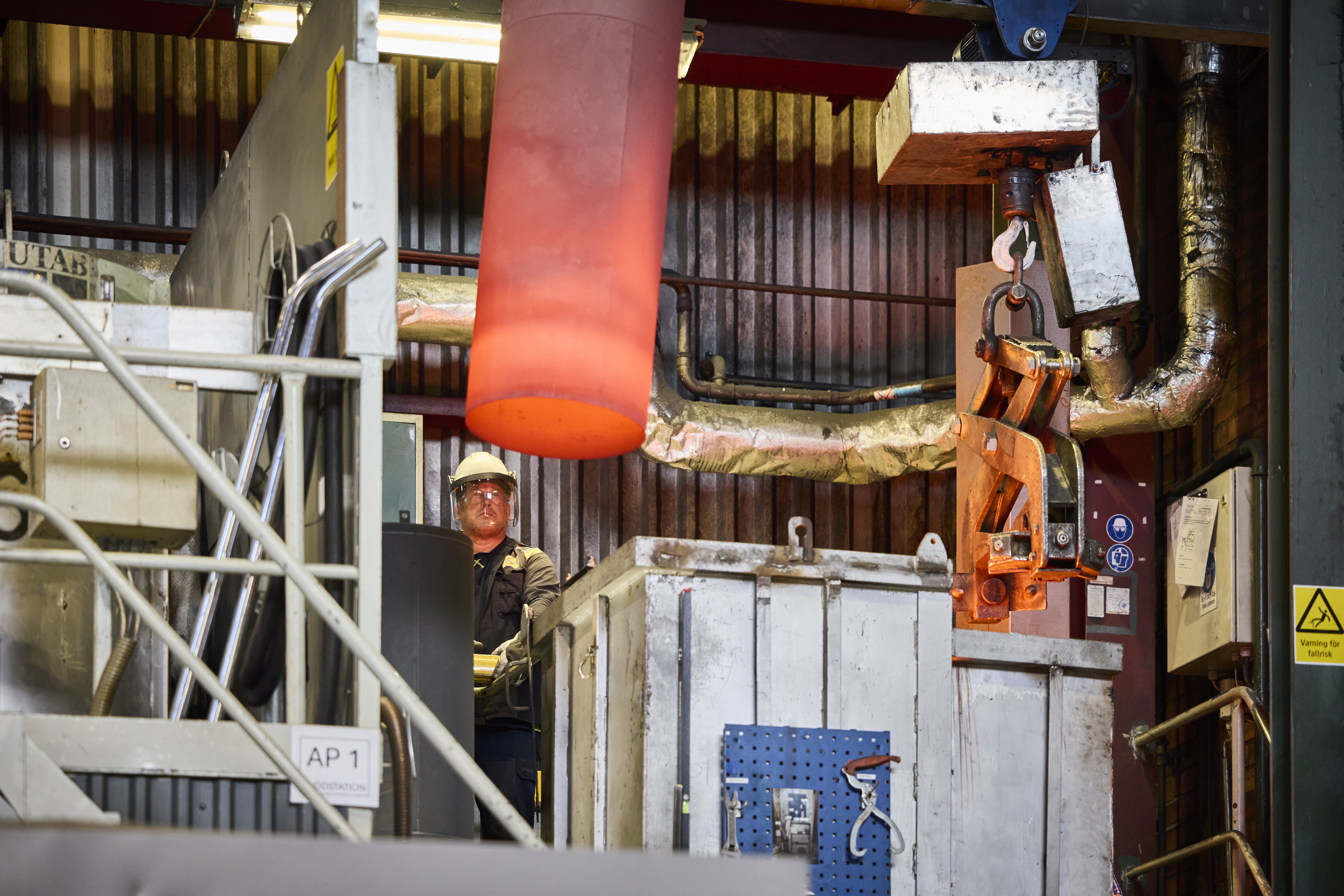 Mikko Myllyniemi lyfter kapsel med kompakterat stålpulver som genomgått hetisostatisk pressning (HIP). Erasteel Kloster AB.